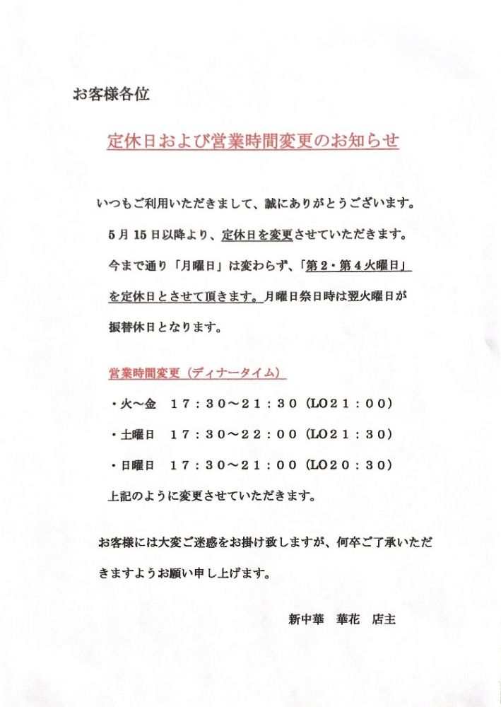 定休日と営業時間の変更のご案内